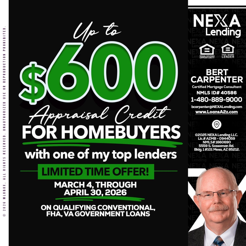 UP TO 600 - Bert Carpenter -Certified Mortgage ConsultantHi, my name is Bert Carpenter. I’m a Loan Officer with NEXA Lending LLC., offering personalized mortgage solutions, fast customized quotes, great rates and service with integrity.